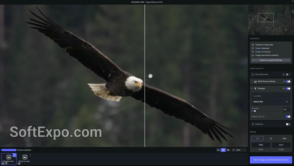 - Autopilot Detection: Automatically scans your image to detect severe noise, blur, and focus issues, suggesting optimal settings immediately.