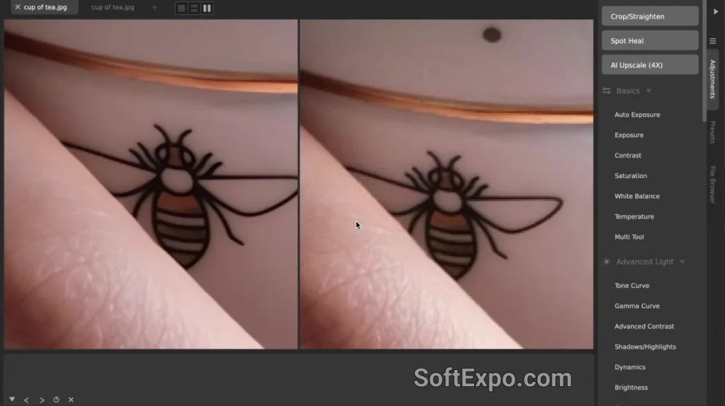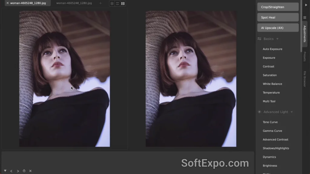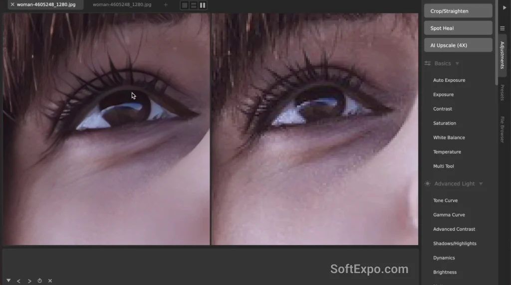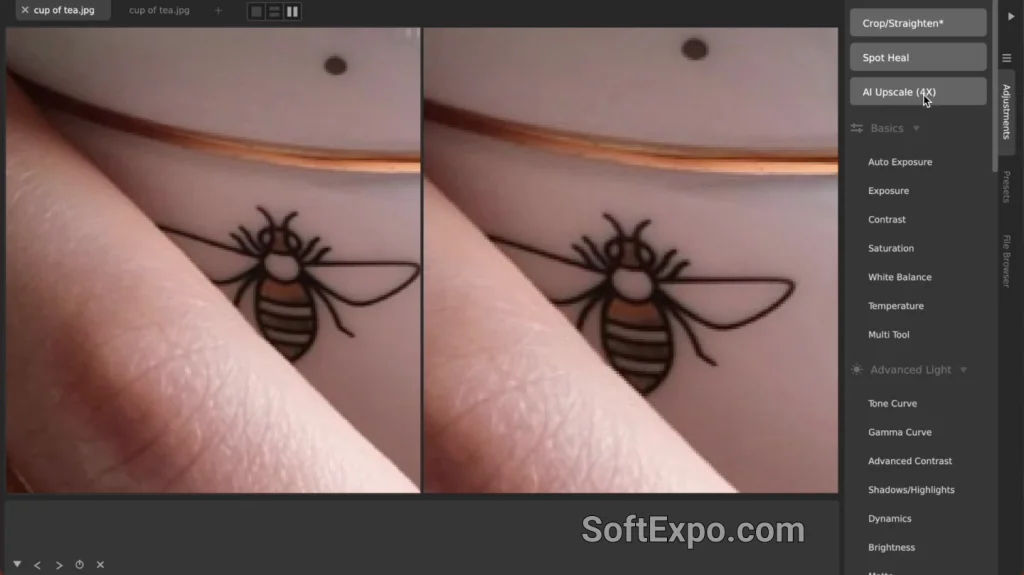 Finding the AI Upscale tool is straightforward within the CameraBag Pro interface on Windows. You can access it directly via the Edit menu at the top of the window, or by locating the dedicated buttons in the Adjustments tab on the right side of the screen. Look for the buttons labeled "AI Upscale (4X)" or the newly added "AI Upscale (2X)." Clicking either button immediately initiates the process. Since the calculation happens on your hardware, processing time may vary depending on your specific Windows system specifications, particularly your graphics card.