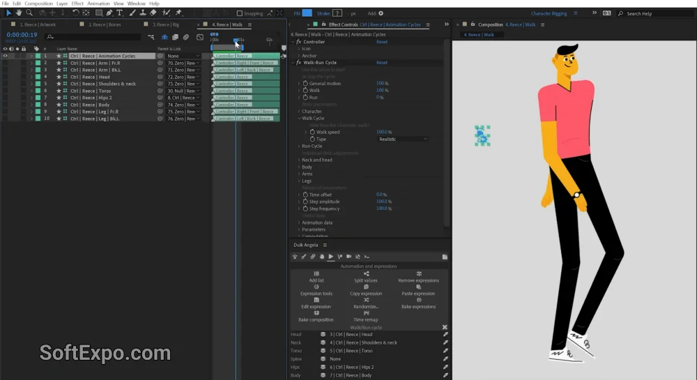 - Auto-Rigging (DUIK Angela): DUIK features a comprehensive auto-rig system that can instantly apply bone structures to humanoid and animal characters.