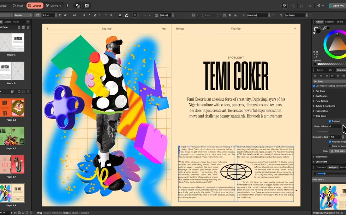 - StudioLink Integration: Seamlessly switch between Affinity Photo and Affinity Designer tools directly within your layout workspace without opening separate apps, allowing for fluid editing of images and vector graphics in real-time.