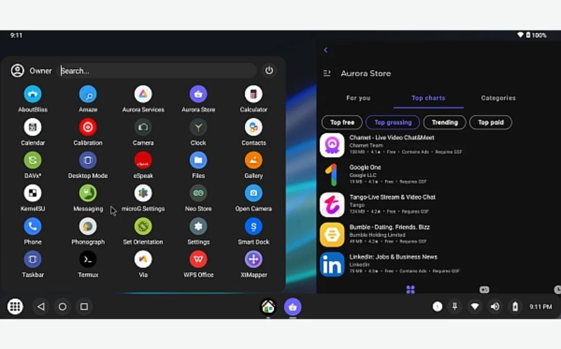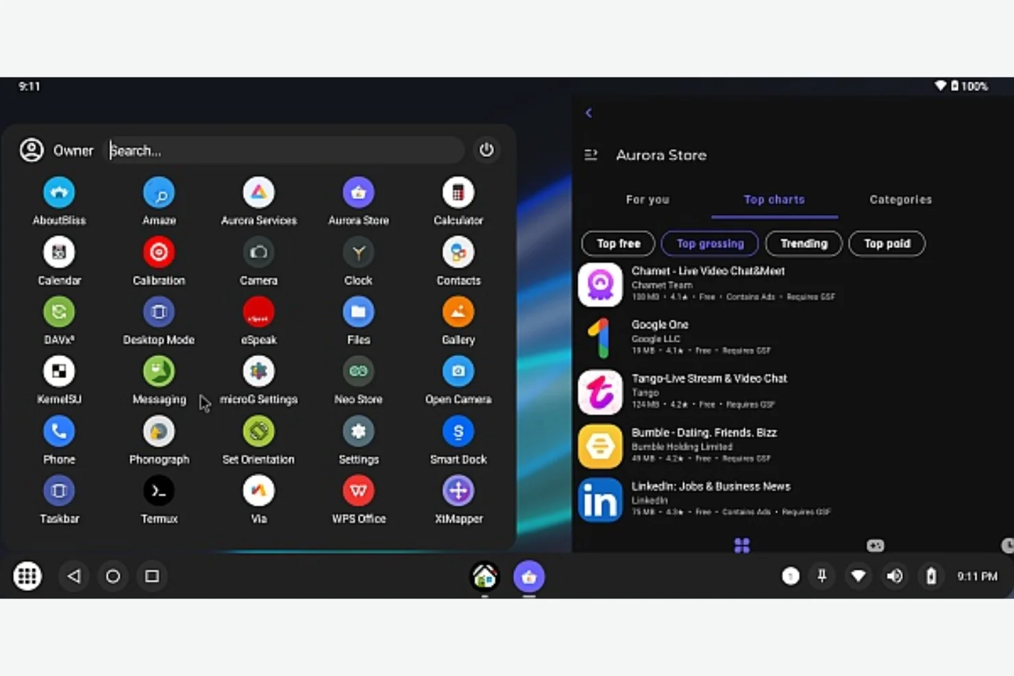 - Desktop Mode Interface: Unlike standard mobile interfaces, Bliss OS includes a dedicated taskbar, start menu (Bliss Button), and multi-window support, making it feel like a traditional desktop environment rather than a stretched phone screen.