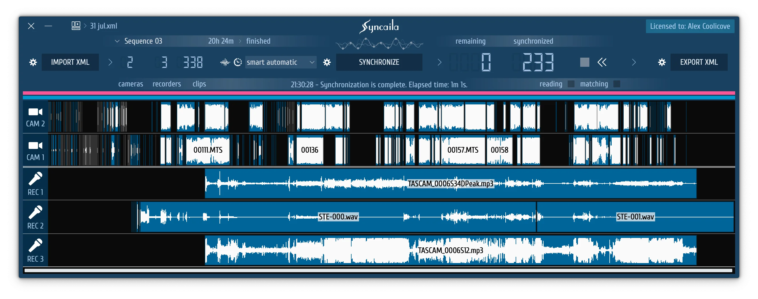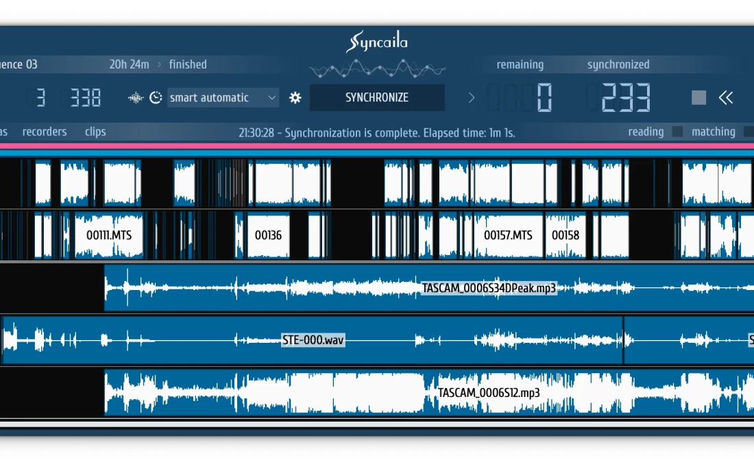 Syncaila is a professional automatic synchronization tool designed to rescue video editors from the tedious manual alignment of multi-camera footage. By analyzing audio waveforms, this specialized software instantly matches video and audio clips from multiple cameras and recorders without requiring timecodes. It serves as a critical bridge in the post-production workflow, allowing creators to focus on the artistic aspects of editing rather than the mechanical task of syncing dailies.