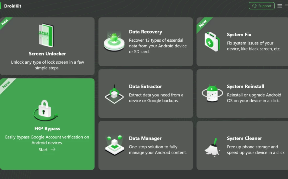 - Screen Unlocker: Removes all types of screen locks, including 4-digit or 6-digit PINs, custom patterns, alphanumeric passwords, fingerprints, and facial recognition, allowing users to regain access to their locked handsets immediately.