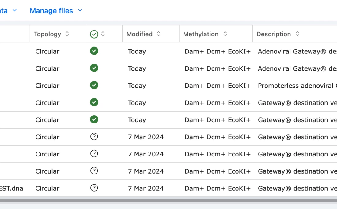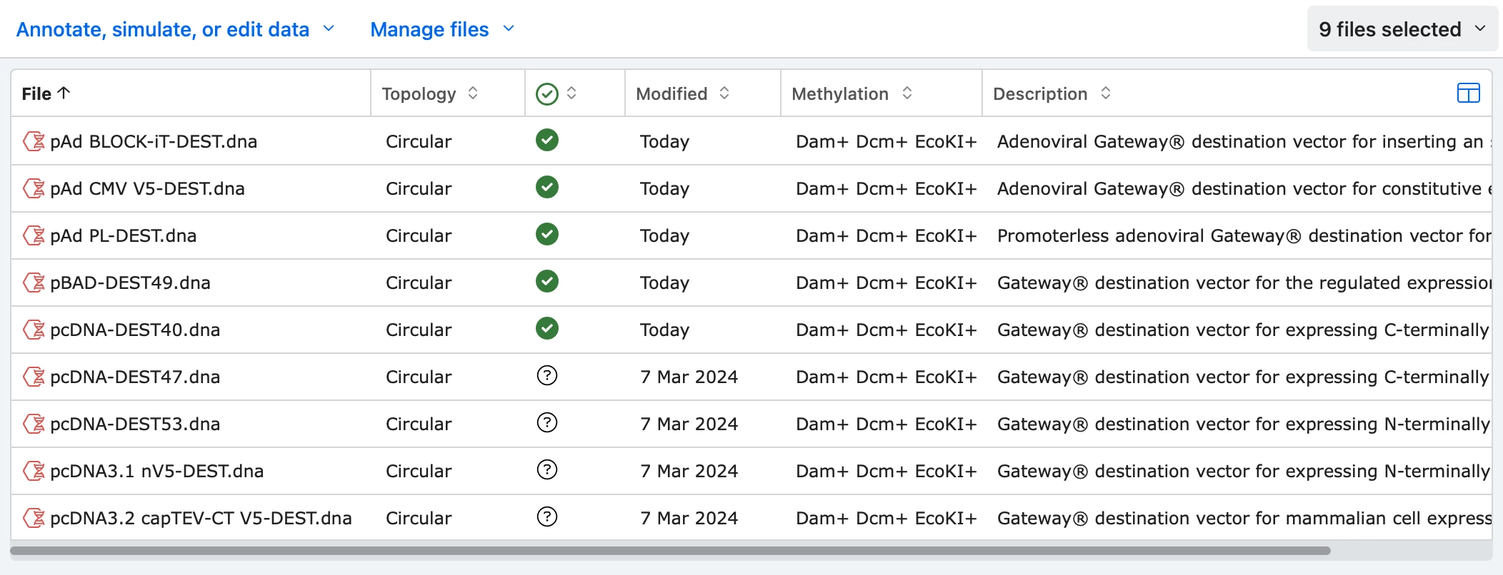- Bulk Annotation & Data Management: Streamlines workflows by allowing users to annotate common features across multiple sequences simultaneously. The updated file info table provides a centralized view of metadata, making it easier to organize large collections of plasmids and primers within a project.