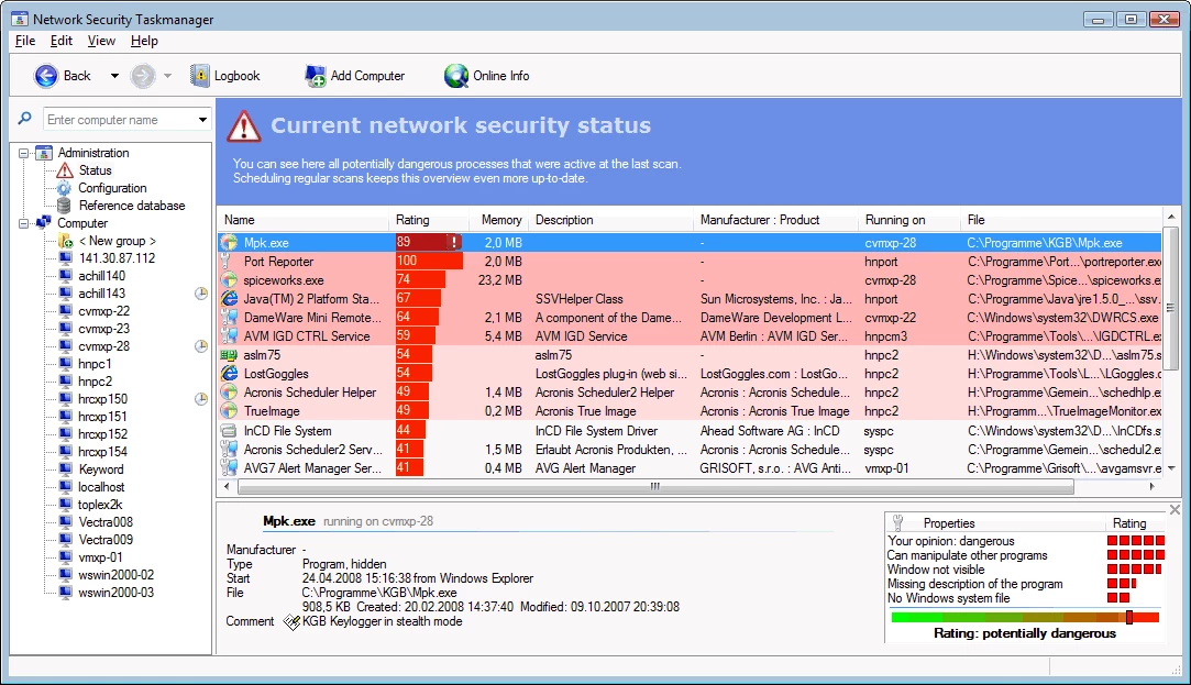 - Security Risk Rating: Unlike standard tools that just list names, this feature assigns a specific risk score (0-100%) to every running process. The rating relies on behavioral analysis and code inspection rather than just signature files, allowing you to spot potential zero-day threats or unknown surveillance software immediately.