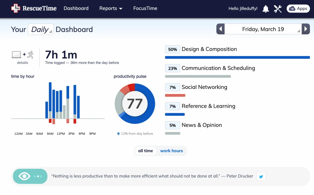 - Detailed Productivity Reports: Generates interactive visual dashboards, daily highlight summaries, and weekly email roundups that automatically categorize your specific software usage into highly productive, neutral, or highly distracting segments.