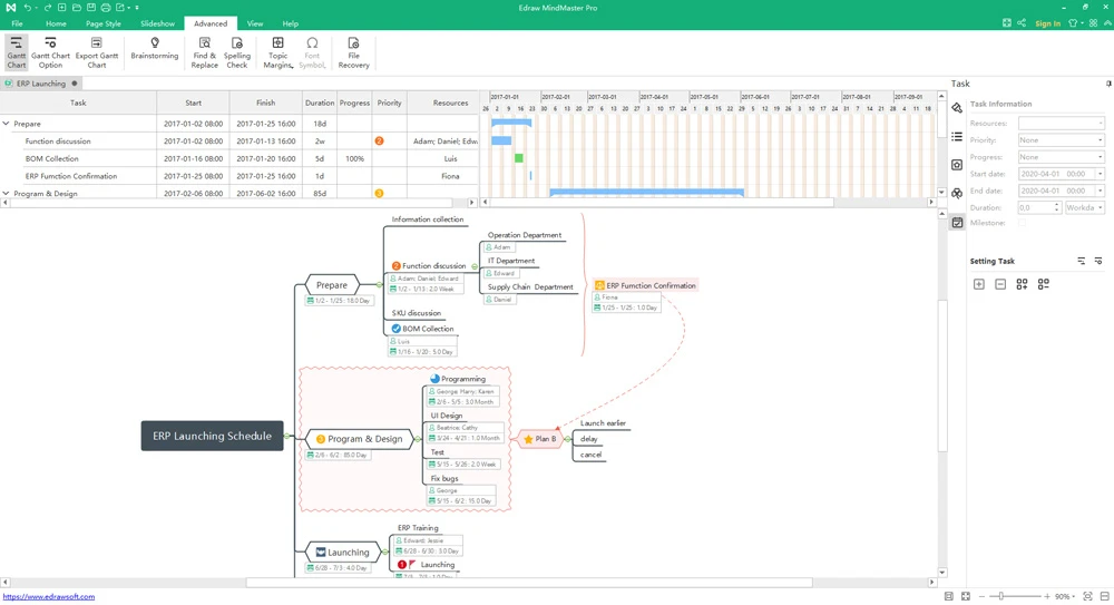 - Gantt Chart View: Illustrates project schedules and shows clear dependency relationships between various map topics, making it simpler for managers to allocate resources over a specific timeline.