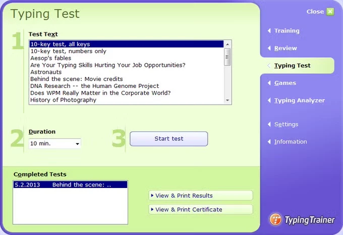 - Professional Speed Tests: Allows you to take advanced typing exams with durations up to 60 minutes and print detailed diplomas to certify your WPM (Words Per Minute) speed.
