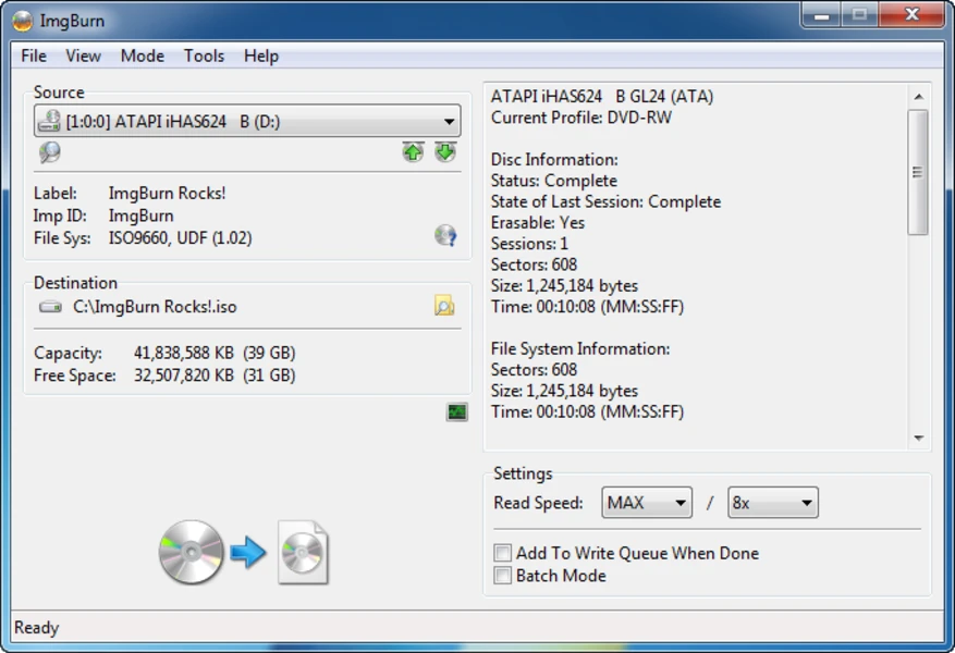 - Five Specialized Modes: The interface is divided into distinct functions—Read (disc to image), Build (files to image/disc), Write (image to disc), Verify (check disc readability), and Discovery (test drive/media quality)—streamlining the workflow for specific tasks.